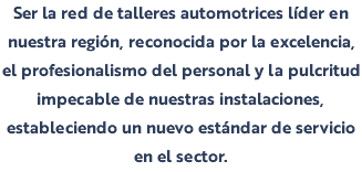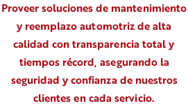 Proveer soluciones de mantenimiento y reemplazo automotriz de alta calidad con transparencia total y tiempos récord, asegurando la seguridad y confianza de nuestros clientes en cada servicio. Ser la red de talleres automotrices líder en nuestra región, reconocida por la excelencia, el profesionalismo del personal y la pulcritud impecable de nuestras instalaciones, estableciendo un nuevo estándar de servicio en el sector. Limpieza. Transparencia, Confianza, Respeto, Excelencia Velocidad.